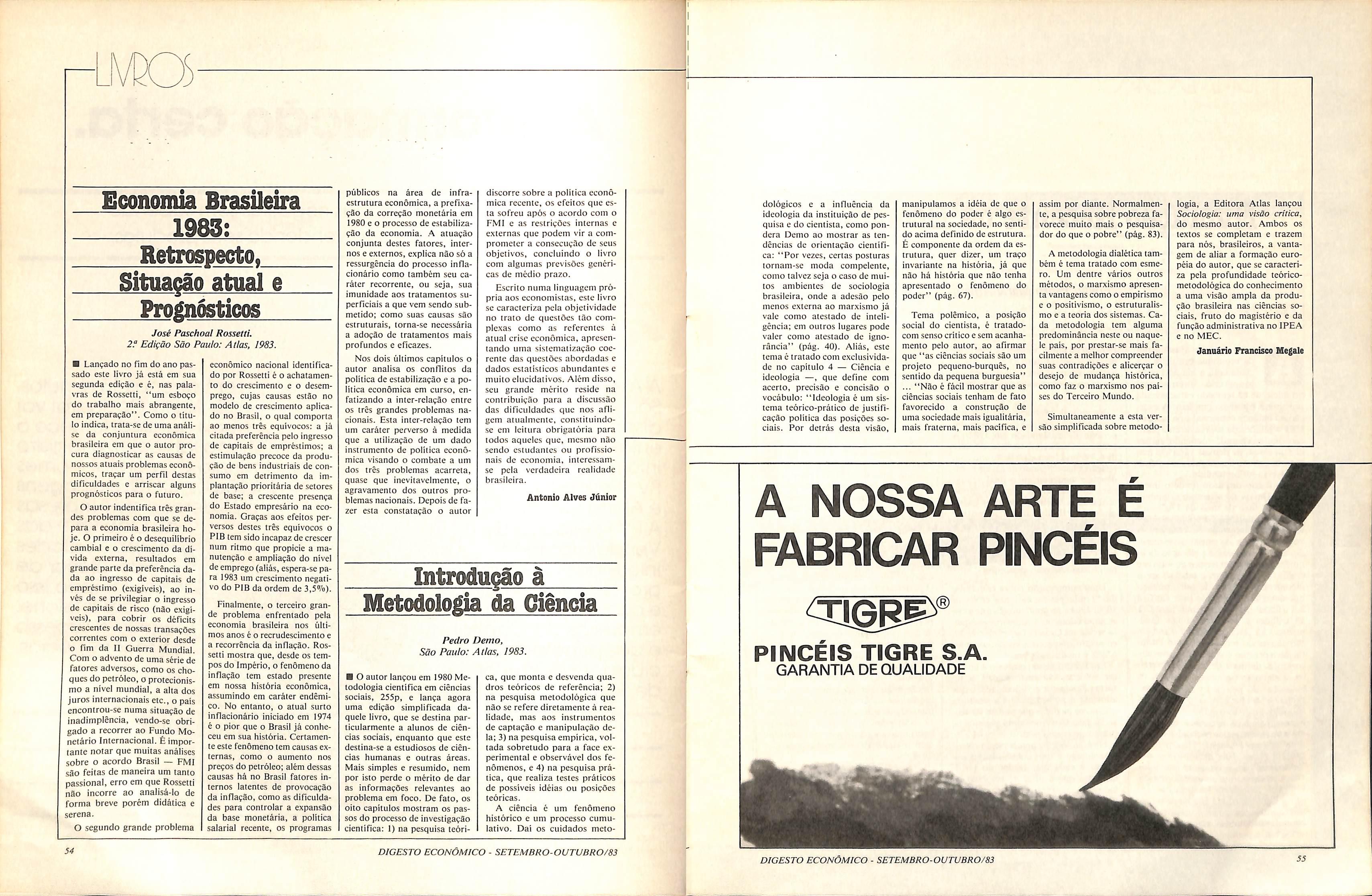 ■ Lançado no fim do ano pas sado este livro já está em sua segunda edição e é, nas pala vras de Rossetti, “um esboço do trabalho mais abrangente, em preparação”. Como o titu lo indica, trata-se de uma análi se da conjuntura econômica brasileira em que o autor pro cura diagnosticar as causas de nossos atuais problemas econô micos, traçar um perfil destas dificuldades e arriscar alguns prognósticos para o futuro.