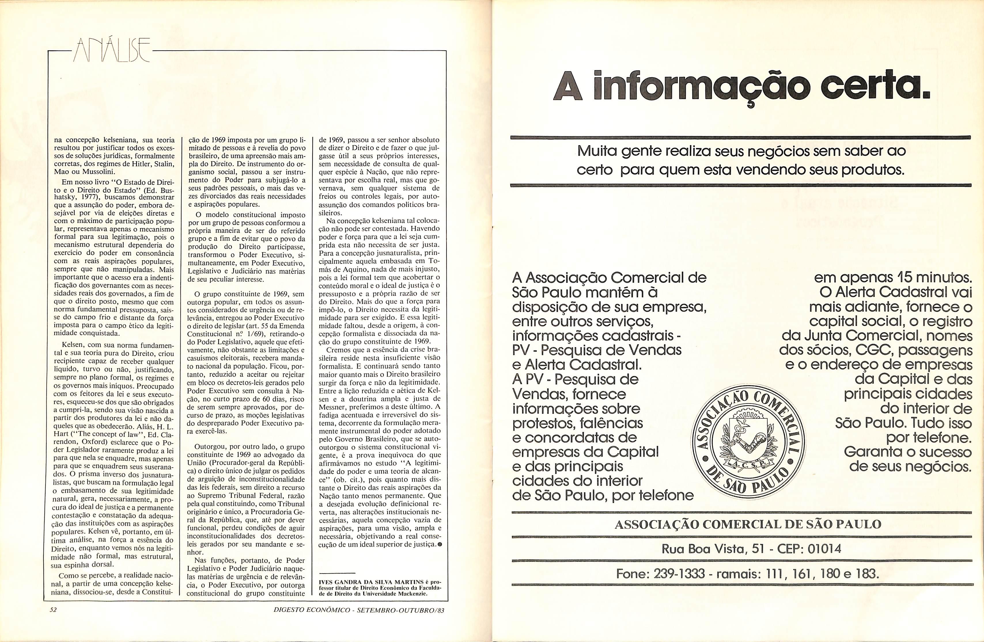 Cremos que a essência da crise bra sileira reside nesta insuficiente visão formalista. E continuará sendo tanto maior quanto mais o Direito brasileiro surgir da força c não da legitimidade. Entre a lição reduzida e aética dc Kclsen e a doutrina ampla e justa dc Messner, preferimos a deste último. A fadiga acentuada e irreversível do si.stema, decorrente da formulação meramente instrumental do poder adotado pelo Governo Brasileiro, que se autooutorgou o sistema constitucional vi gente, é a prova inequívoca do que afirmávamos no estudo “A legitimi dade do poder c uma teoria de alcan ce” (ob. cit.), pois quanto mais dis tante o Direito das reais aspirações da Nação tanto menos permanente. Que a desejada evolução definicional re verta, nas alterações institucionais ne cessárias, aquela concepção vazia dc aspirações, para uma visão, ampla c necessária, objetivando a real conse cução de um ideal superior de justiça.®