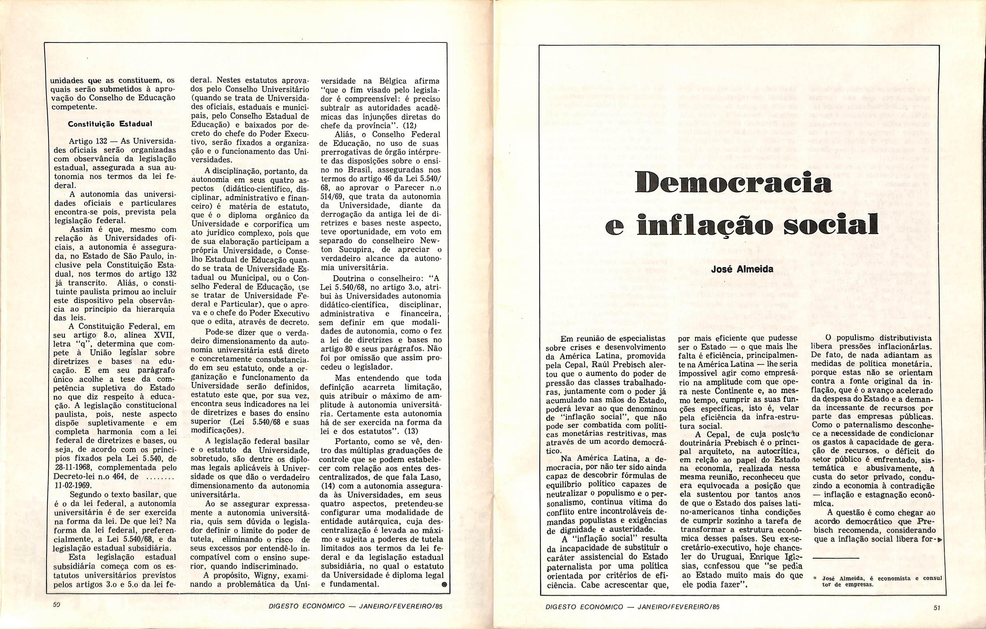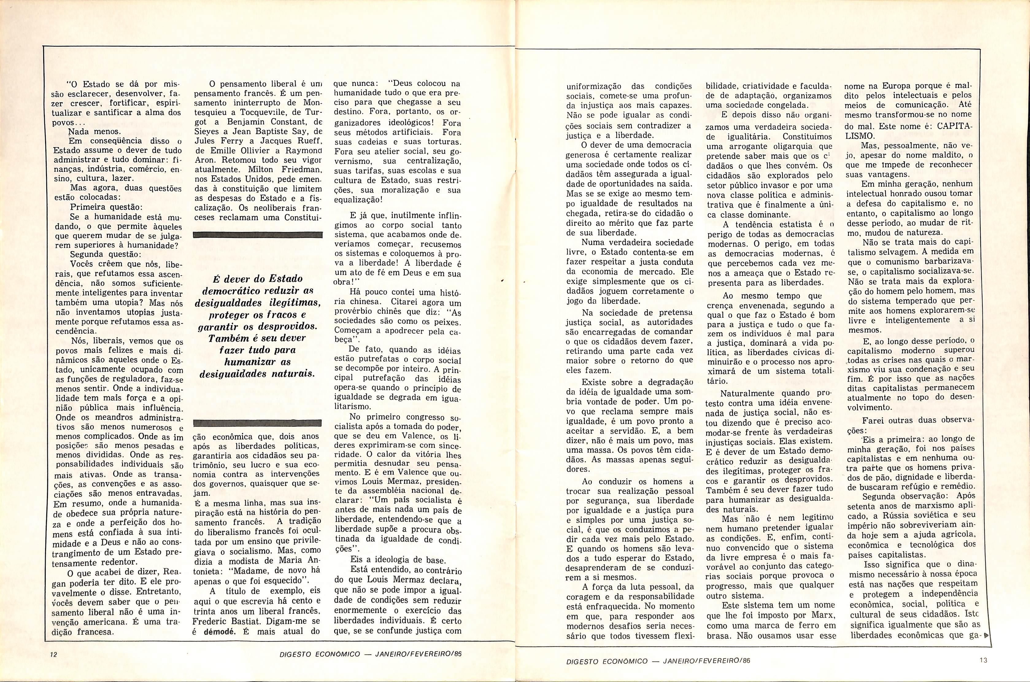 O Brasil aprendeu a duras pe nas. com seu sacrifício, o que é 0 estatismo econômico, ou, em outras palavras, o antiliberalismo. O déficit público, cau sado pelas empresas estatais e pelo crescimento do setor sob a responsabilidade do Estado, gerou, alimentou e aumentou a inflação, tornando insuportável a vida dos assalariados brasilei ros. Tornou-se mais negócio não fazer nenhum negócio, senão es pecular, do que trabalhar, construtivamente, para e pelo bem da Nação. Formou-se, então, também no Brasil, particular, mente em São Paulo, a corrente liberal, decidida a se opor ao estatismo. Essa corrente conta com 0 nosso inteiro apoio. Ela está vitoriosa. O povo tomou consciência de seus princípios, convencido de que a liberdade e a democracia não podem evoluir sob o estatismo. Esse o tema à\\ nossa principal matéria c da nossa capa. Outras matérias de interesse permanente blicadas, segundo a tradicional Unha da revista.