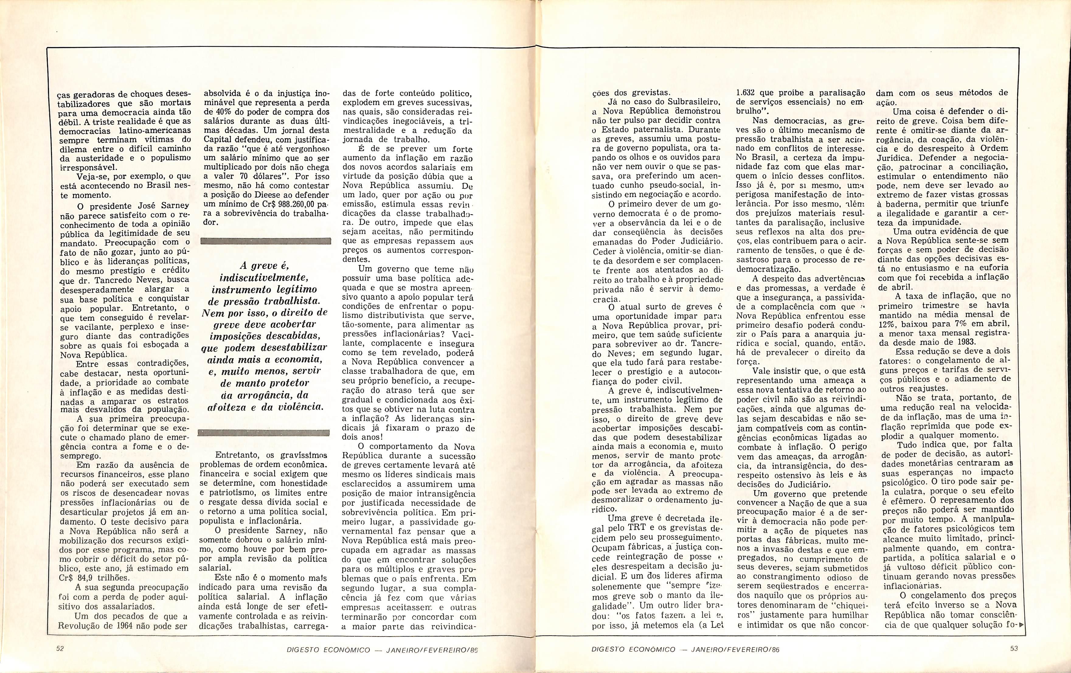 das de forte conteúdo político, explodem em greves sucessivas, nas quais, são consideradas rei vindicações inegociáveis, a trimestralidade e a redução da jornada de trabalho. É de se prever um forte aumento da inflação em razão dos novos acordos salariais em virtude da posição dúbia que a Nova República assumiu. De um lado, quer por ação ou por emissão, estimula essas reviri dicações da classe trabalhado ra. De outro, impede que elas sejam aceitas, não permitindo que as empresas repassem aos preços os aumentos correspon dentes.