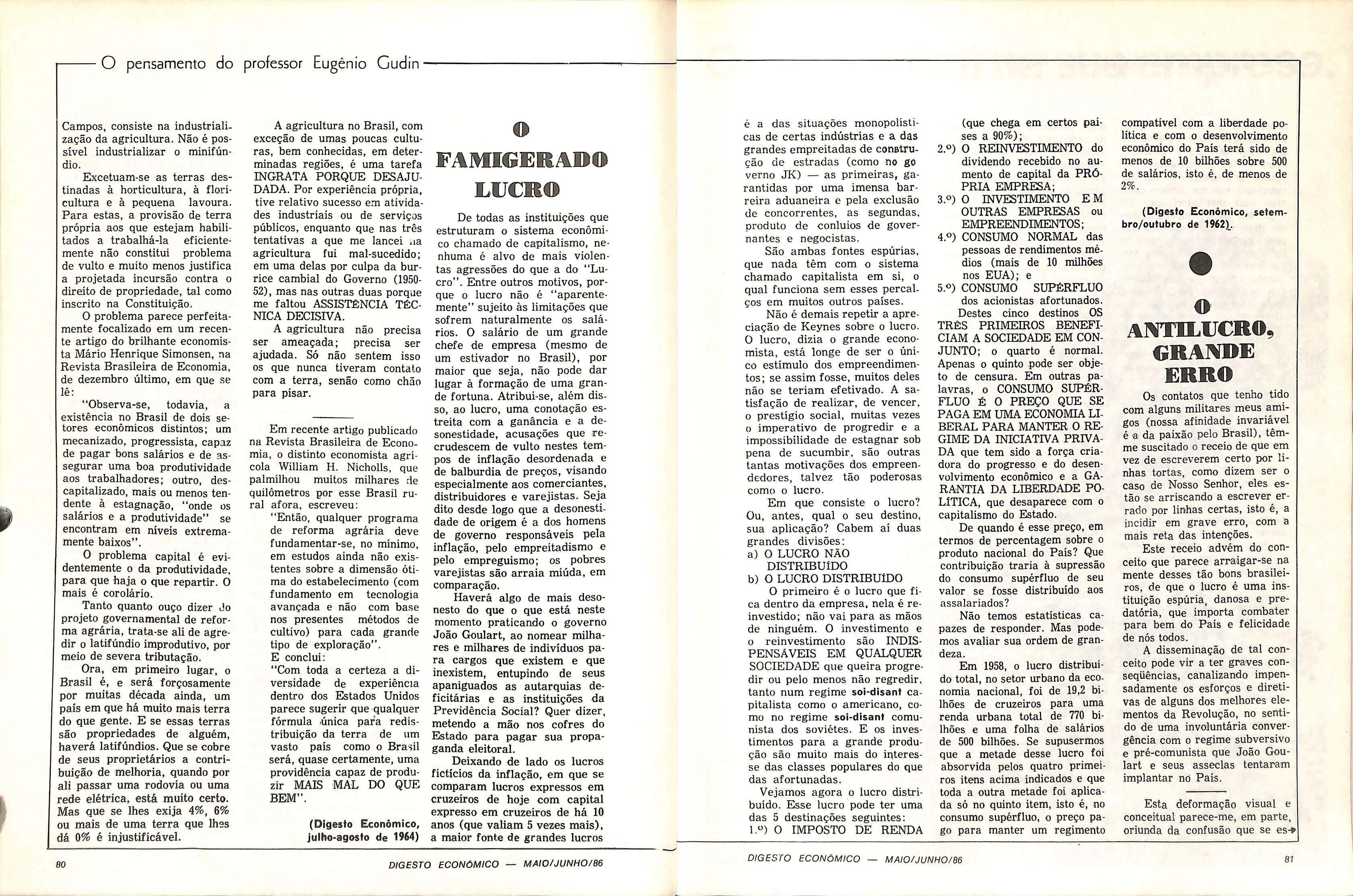 ft se comparação. Haverá algo de mais deso nesto do que o que está neste momento praticando o governo cultivo) para cada grande joão Goulart, ao nomear milha- tipo de exploração”. E conclui: res e milhares de indivíduos pa ra cargos que existem e que inexistem, entupindo de seus expenencia apaniguados as autarquias dedentro dos Estados Unidos ficitárias e as instituições <ia parece sugerir que qualquer Previdência Social? Quer dizer, fórmula única para redistribuição da terra de um Estado para pagar sua propavasto país como o Brasil ganda eleitoral, será, quase certamente, uma providência capaz de produ- fictícios da inflação, em que se zir MAIS MAL DO QUE comparam lucros expressos em cruzeiros de hoje com capital expresso em cruzeiros de há 10 (Digesto Econômico, anos (que valiam 5 vezes mais), julho-agosto de 1964) a maior fonte de grandes lucros