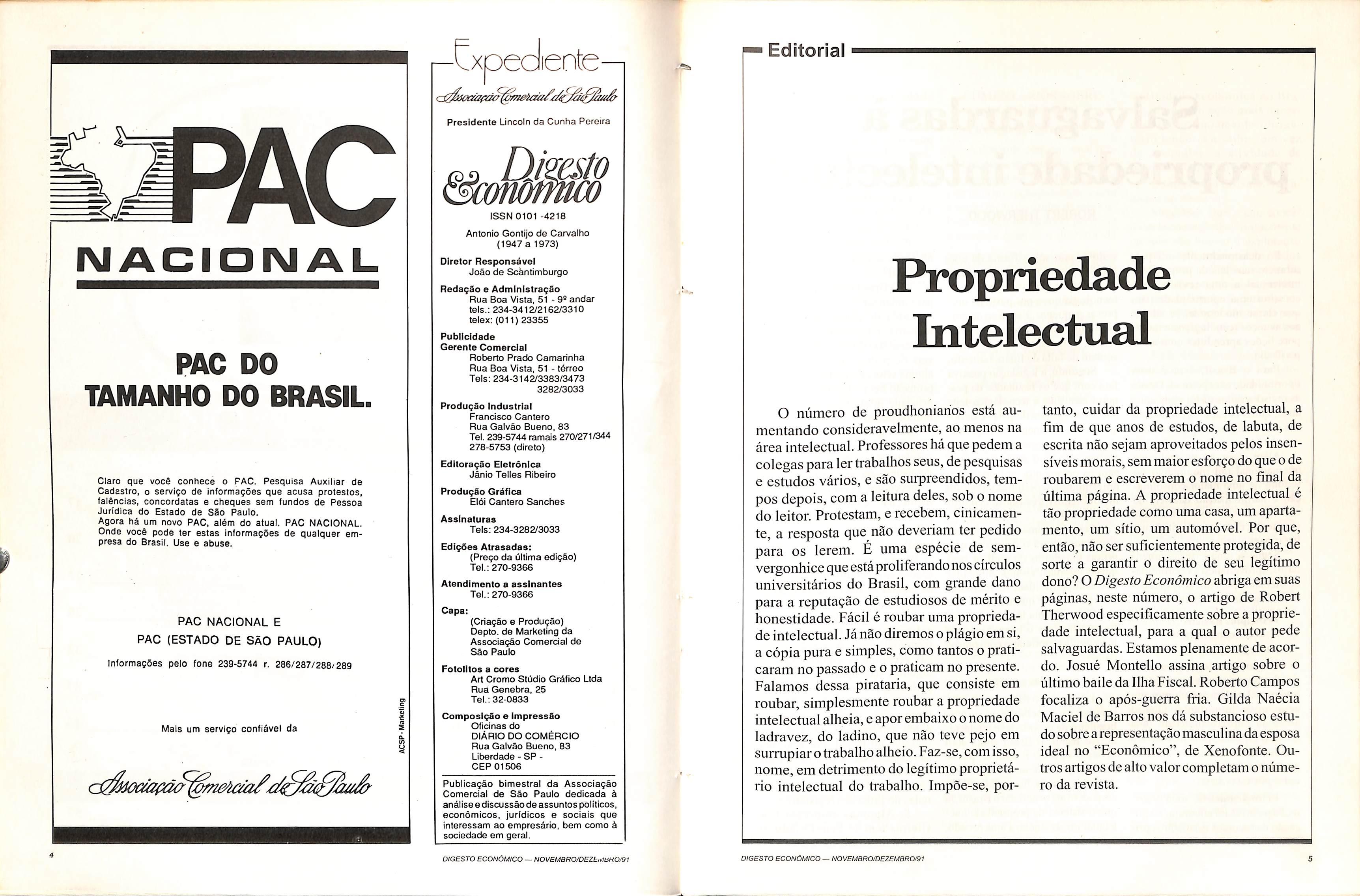 tanto, cuidar da propriedade intelectual, a fim de que anos de estudos, de labuta, de escrita não sejam aproveitados pelos insen síveis morais, sem maior esforço do que o de roubarem e escreverem o nome no final da última página. A propriedade intelectual é tão propriedade como uma casa, um aparta mento, um sítio, um automóvel. Por que, então, não ser siificientemente protegida, de sorte a garantir o direito de seu legítimo dono? O Digesto Econômico abriga em suas páginas, neste número, o artigo de Robert Therwood especificamente sobre a proprie dade intelectual, para a qual o autor pede salvaguardas. Estamos plenamente de acor do. Josué Montello assina artigo sobre o último baile da Ilha Fiscal. Roberto Campos focaliza o após-guerra fria. Gilda Naécia Maciel de Bairos nos dá substancioso estu do sobre a representação masculina da esposa ideal no “Econômico”, de Xenofonte. Ou tros artigos de alto valor completam o núme ro da revista.