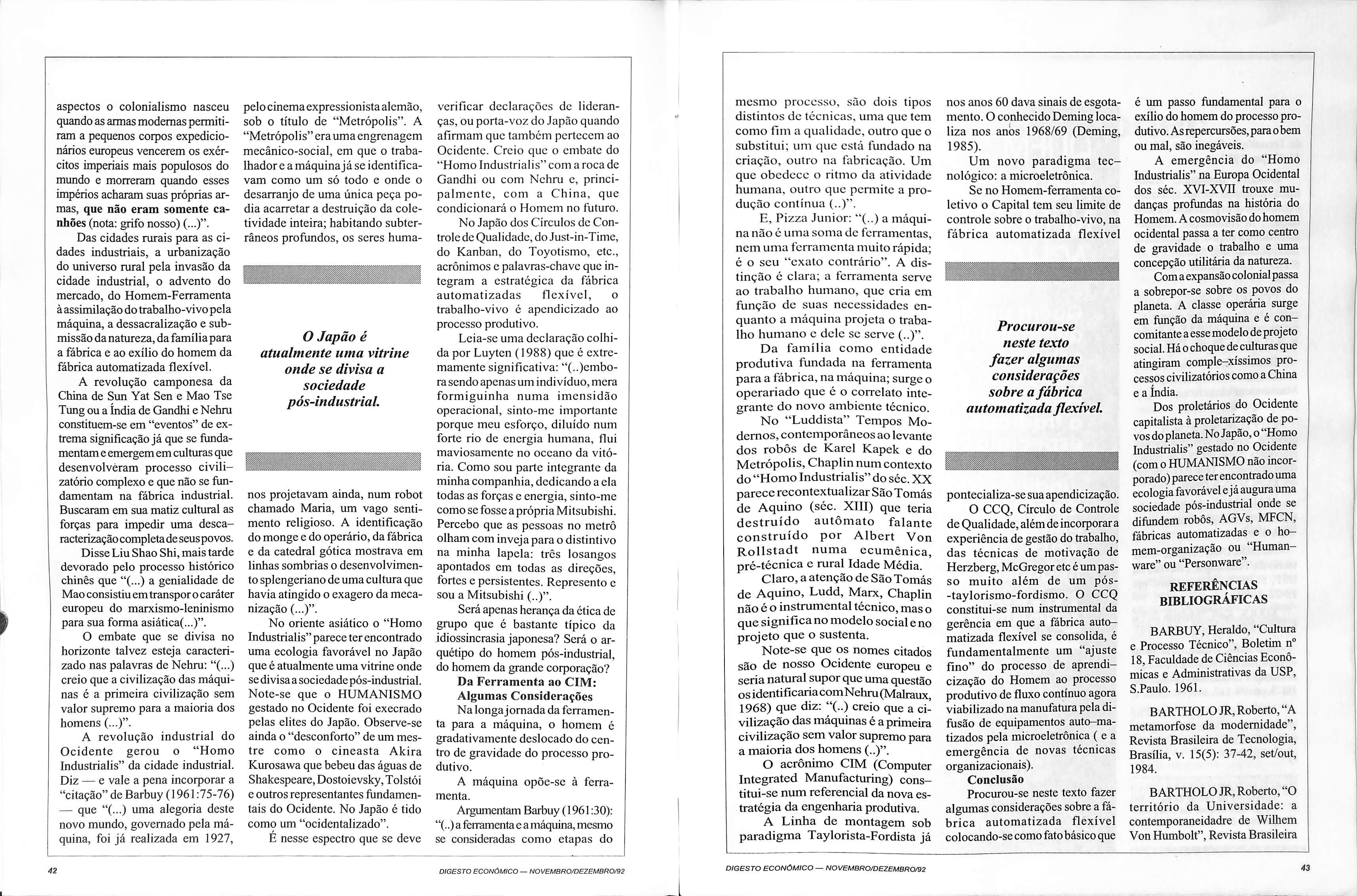 Da mesma forma, o “novo paradigma” está matando velhos conceitos de organização do tra balho. A “sociedade instruída” enterrou o conceito fundamental do “fordismo”, isto é, o cumpri mento de tarefas mecânicas, que se complementaram. O “homem ins truído” precisa tomar conheci mento de quase todo o processo produtivo, não ser isolado numa tarefa “alienada”. Apesar da valo-
