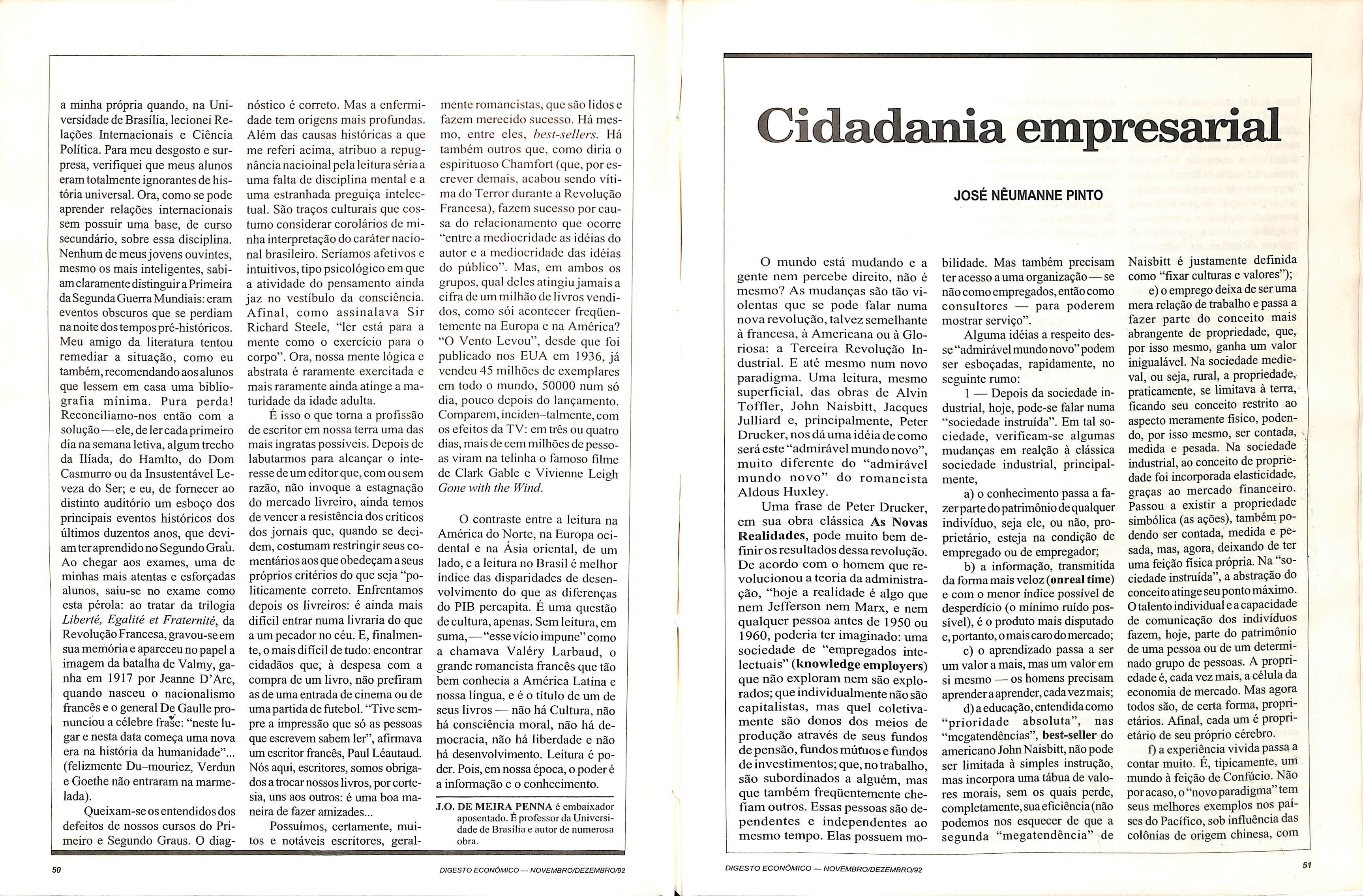 Central da Universidade de Harvard, pode-se verificar a pre sença regular de 178 revistas e publicações periódicas brasilei ras. Duvido que um número idêntico exista na Biblioteca da Universidade de Brasília, que é hoje 0 padão da República — e muito menos 178 períodicos do resto do mundo! Na biblioteca do Itamaraty recebe-se quando muito uma dúzia de revistas estrangeiras seus pensamentos”. A Câmara dos e a explicação é invariável: fal^ de Deputados, que reflete a cultura do verbas. EmHarvard, ondees^ ou, povò por ser dele representante, meu filho era obrigado a ler e expõe às claras o desastre de falta a 200 páginas por dia em seu cmso de leitura. O descalabro da instru- de mestrado enquanto na un dação Getúlio Vargas, onde tirou o