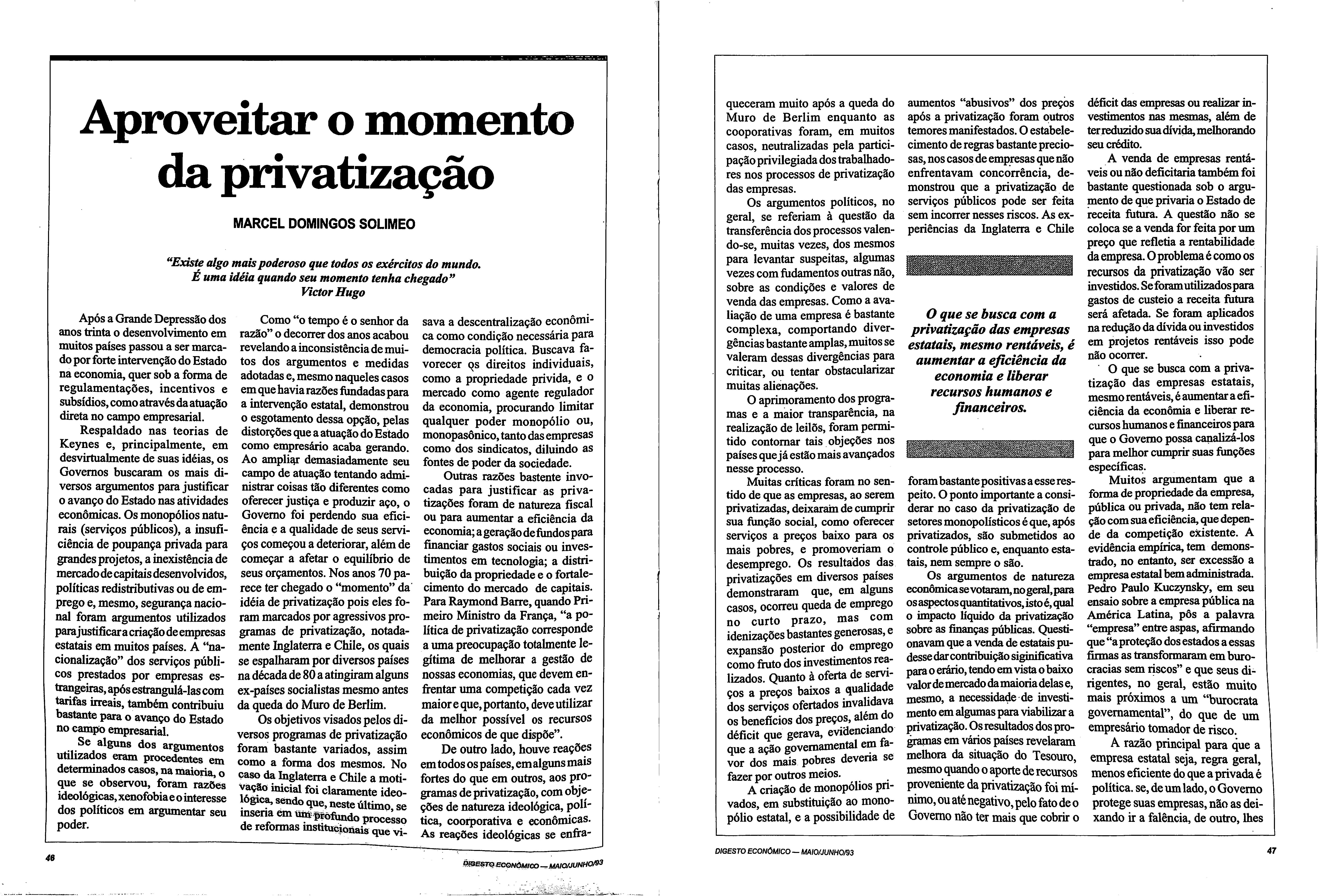 No caso chileno, segundo Hachette e Lüders, o fator funda mental do êxito das privatizações foi um presidente “absolutamente consciente da importância econô mica e política” do processo o que parece ser, atualmente, a posição do presidente Itamar Franco. Se essa for realmente, sua convicção é necessário que ele tenha “deter minação e agilidade” para que o Programa de Privatização avance com a rapidez que a situação bra sileira exige para começar a pagar. O “momento” da privatização não pode ser perdido pelo Brasil como tantas oportunidades.