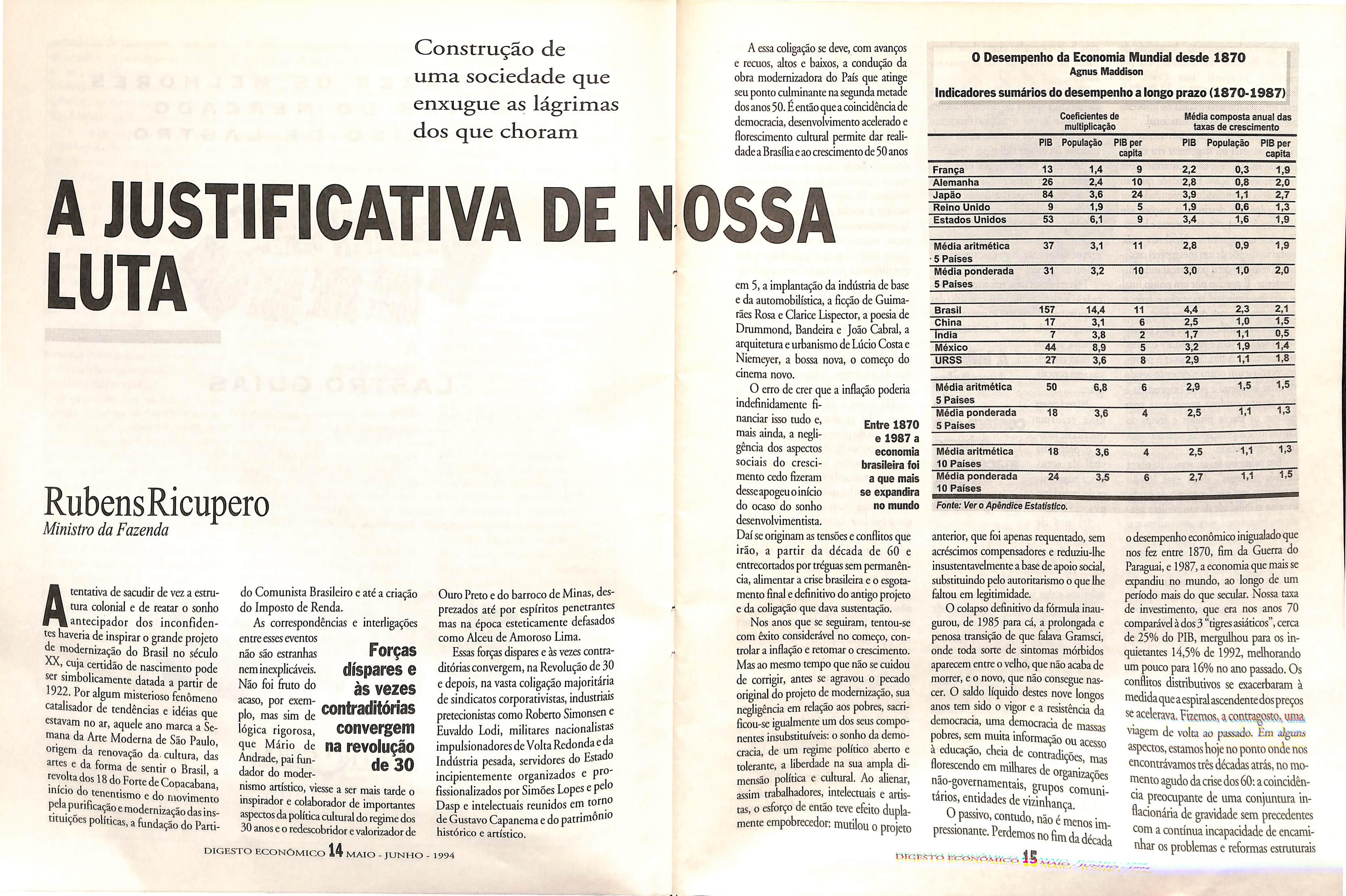 0 desempenho econômico inigualado que nos fez entre 1870, fim da Guerra do Paraguai, e 1987, a economia que mais se expandiu no mundo, ao longo de período mais do que secular. Nossa taxa de investimento, que era nos anos 70 comparável à dos 3 “tigres asiáticos”, cerca de 25% do PIB, merguUiou para os inquietantes 14,5% de 1992, melhorando um pouco para 16% no ano passado. Os conflitos distributivos se exacerbaram à medida que aespiral ascendente dos preços se acelerava. Fizemos, a contragosto, uma viagem de volta ao passado. Em alguns aspectos, estamos hoje no ponto onde nos encontrávamos três décadas atrás, no mo mento agudo da crise dos 60: a coincidên cia preocupante de uma conjuntura flacionária de gravidade sem precedentes com a contínua incapacidade de encami nhar os problemas e reformas estruturais