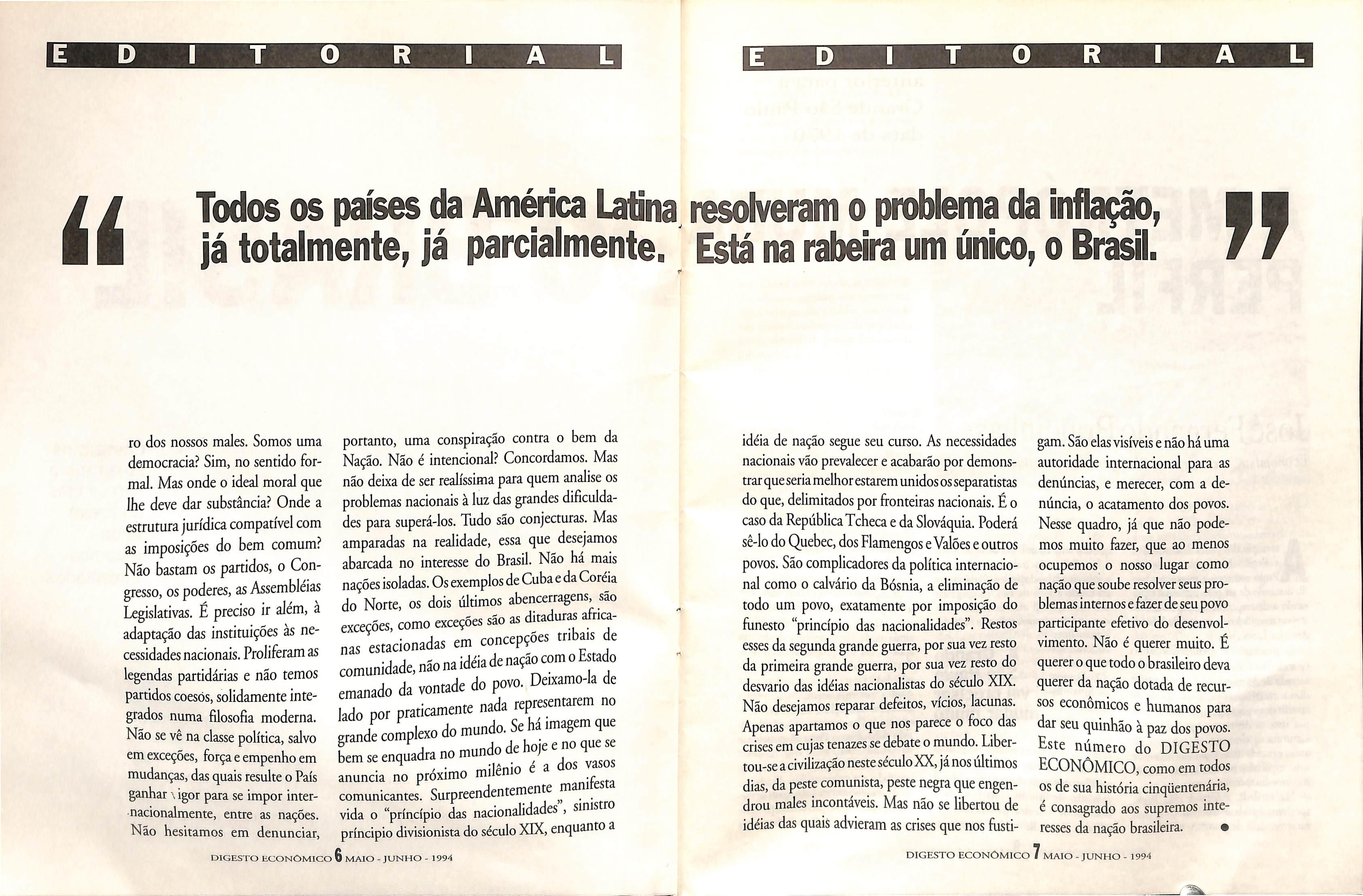 de vinte anos de suplício. Não é citável outro exemplo tão prolongado de e anomalia monetária, entre nações razoavel mente integradas no quadro das democracias do Sistema Ocidental. Todos os países da América Latina resolveram o problema da inflação, já totalmente, já parcialmente. Está na rabeira um único, 0 Brasil. É esse um recorde que nos deslustra. Que juízo fazem de nós os tecnocratas do F.M.I., do Banco Mundial e outras agências financeiras? Passam os governos e não saímos do areial onde estamos encalhados se a figura ilustra anomia em no a situação crítica em que nos encontramos. Essa incapacidade para resolver o problema, incapacidade que nao deve ser debitada a um