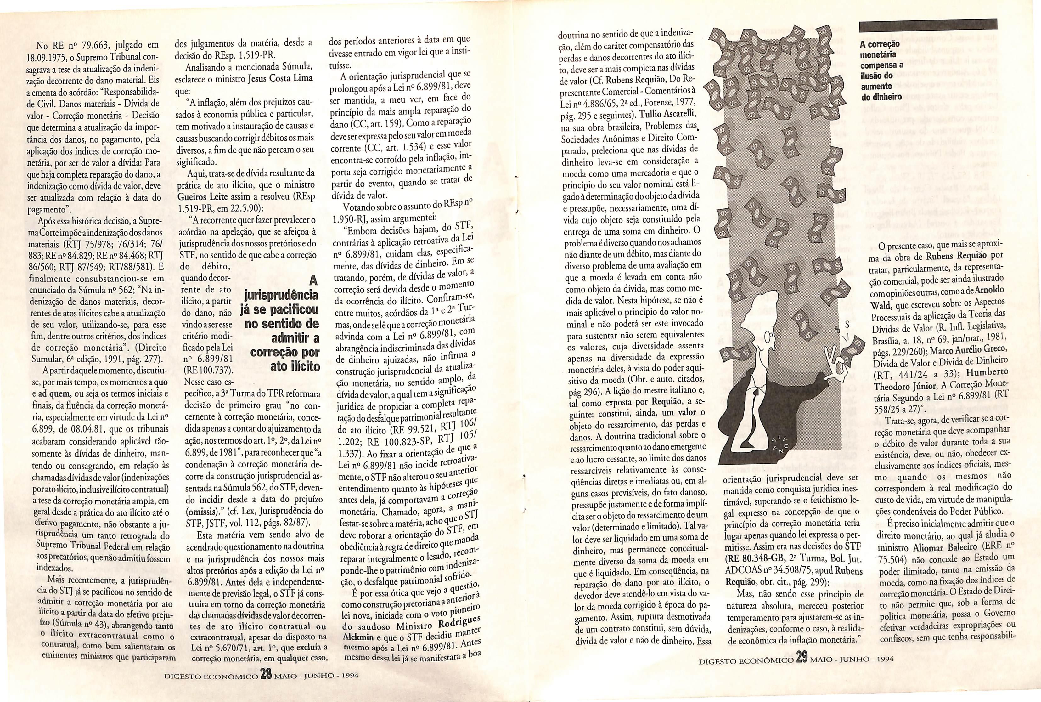 Mais recentemente, a jurisprudên cia do STJ já se pacificou no sentido de admitir a ilícito correção monetária por ato a partir da data do efetivo preju ízo (Súmula n*» 43), abrangendo o ilícito extraconiratual contratual, como bem salientaram eminentes ministros que participaram tes de ato ilícito contratual ou extracontratual, apesar do disposto na Lei n° 5.670/71, ait. que excluía a correção monetária, em qualquer caso, tanto como o os