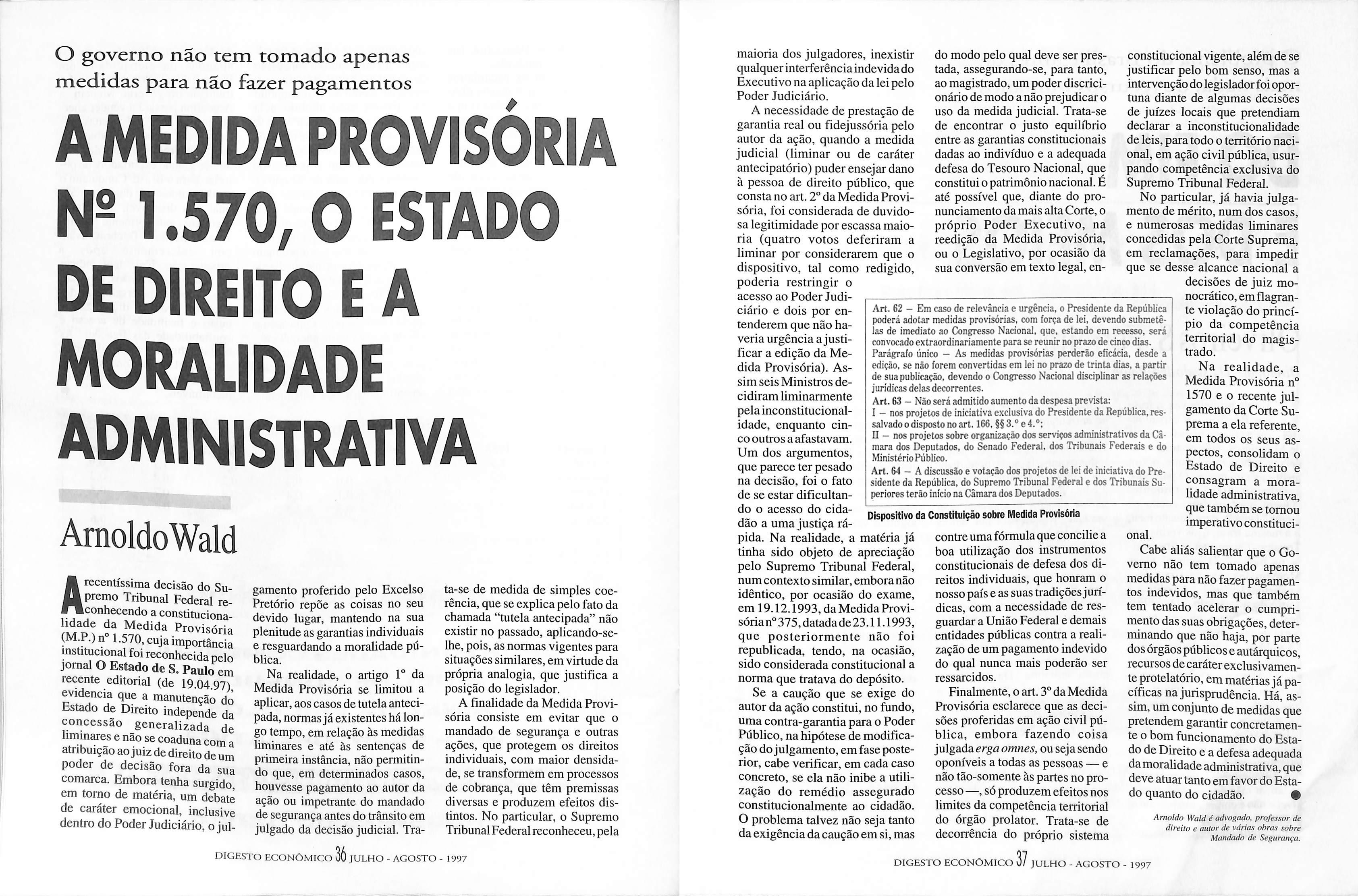 Na realidade, a Medida Provisória n° 1570 e 0 recente jul gamento da Corte Su prema a ela referente, em todos os seus as pectos, consolidam o Estado de Direito e consagram a mora lidade administrativa, que também se tomou imperativo constituci-