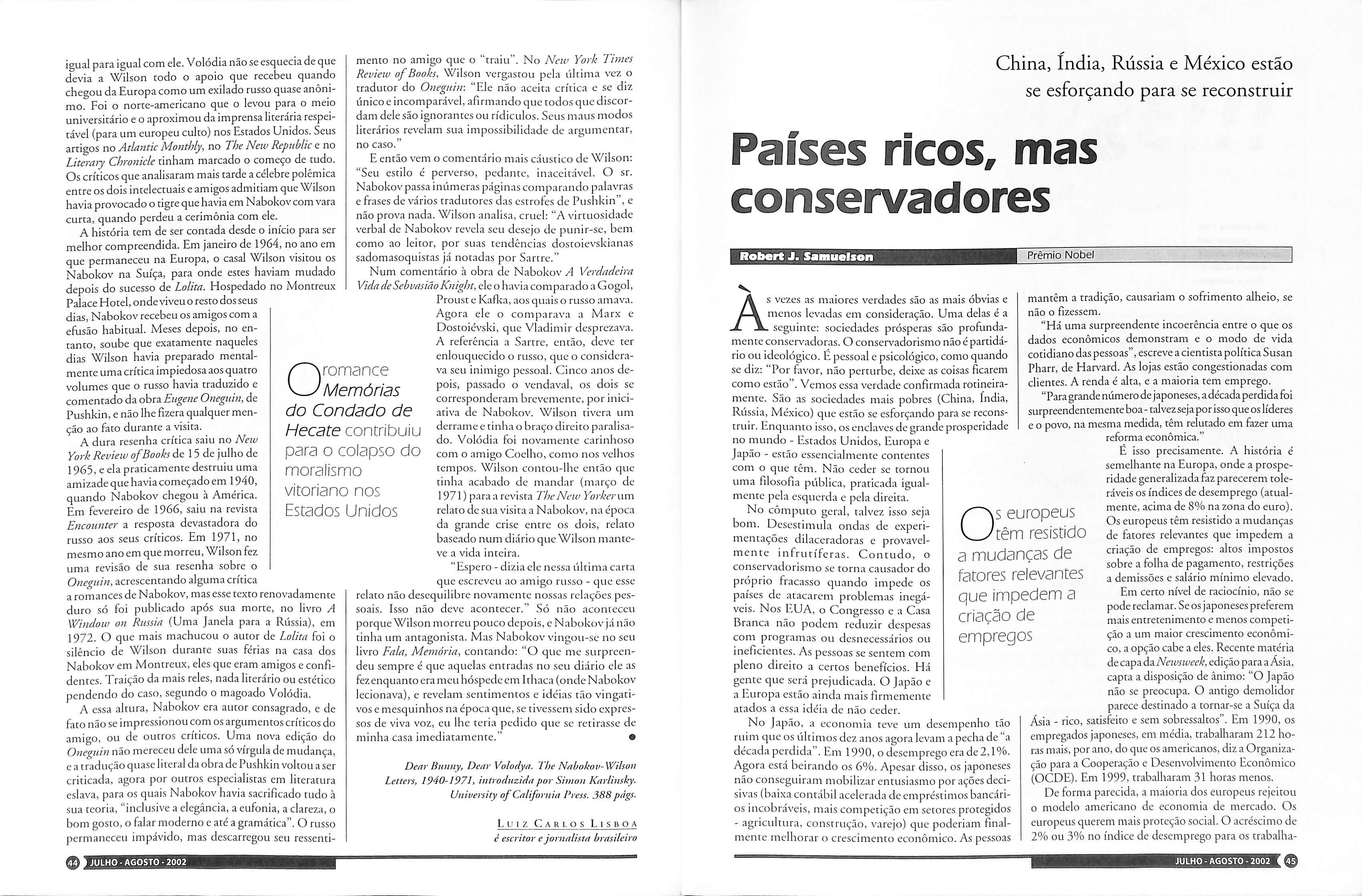 Denr Bunny, Dear Volodya. The Nabokov-Wilson Letters, 1940-1971, introduzida por Sinuni Karlinsky. University of Califórnia Press. 388 págs.