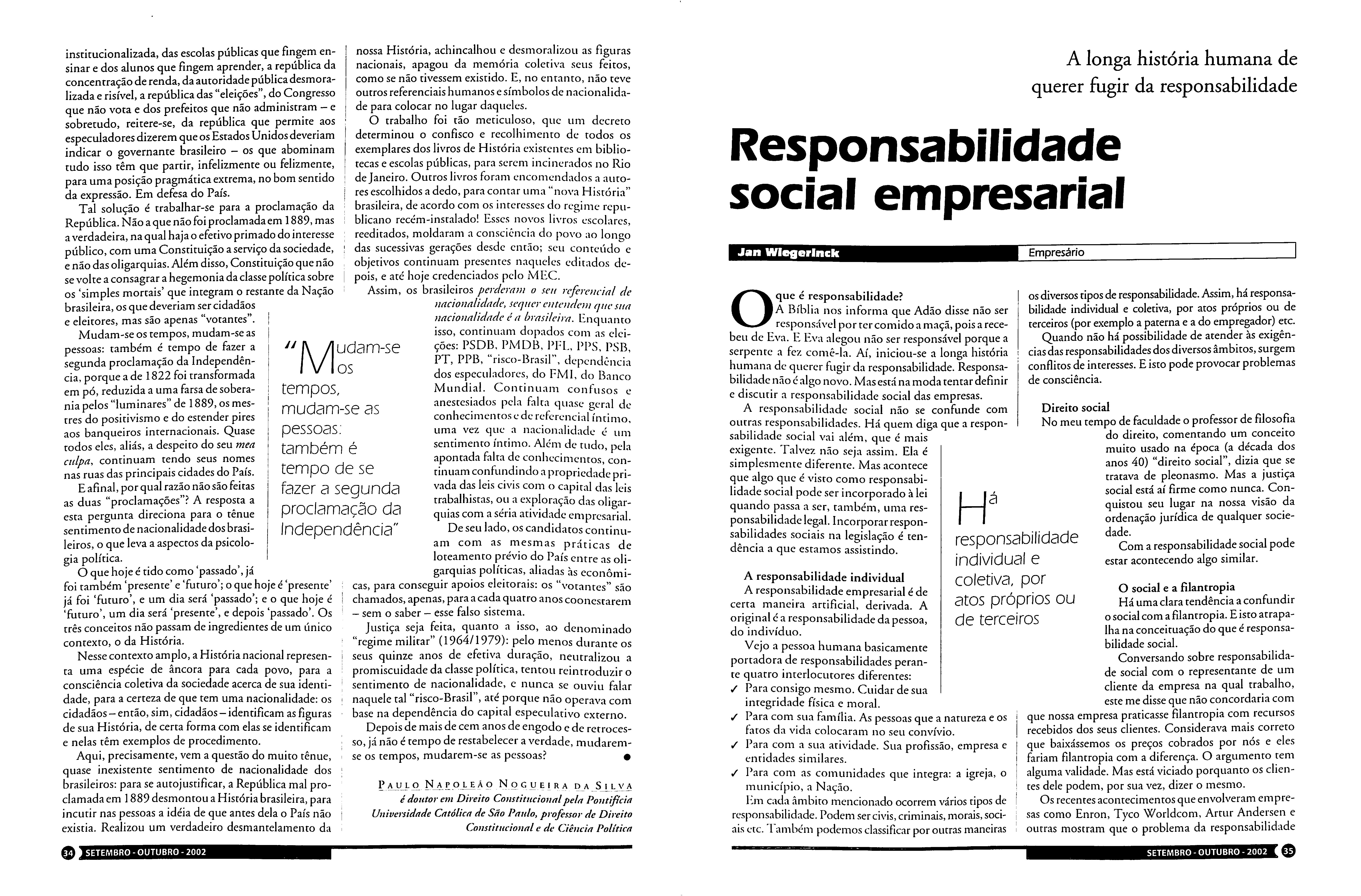 Vejo a responsabilidade social como algo integrante de toda atividade econômica. Não é algo que se j-)ossa ou não, adicionar. Não e algo que se í'az alóm e fora do expediente. Ii o que sc laz. e também como se fazem as coisas e sc conduz o negcAio.