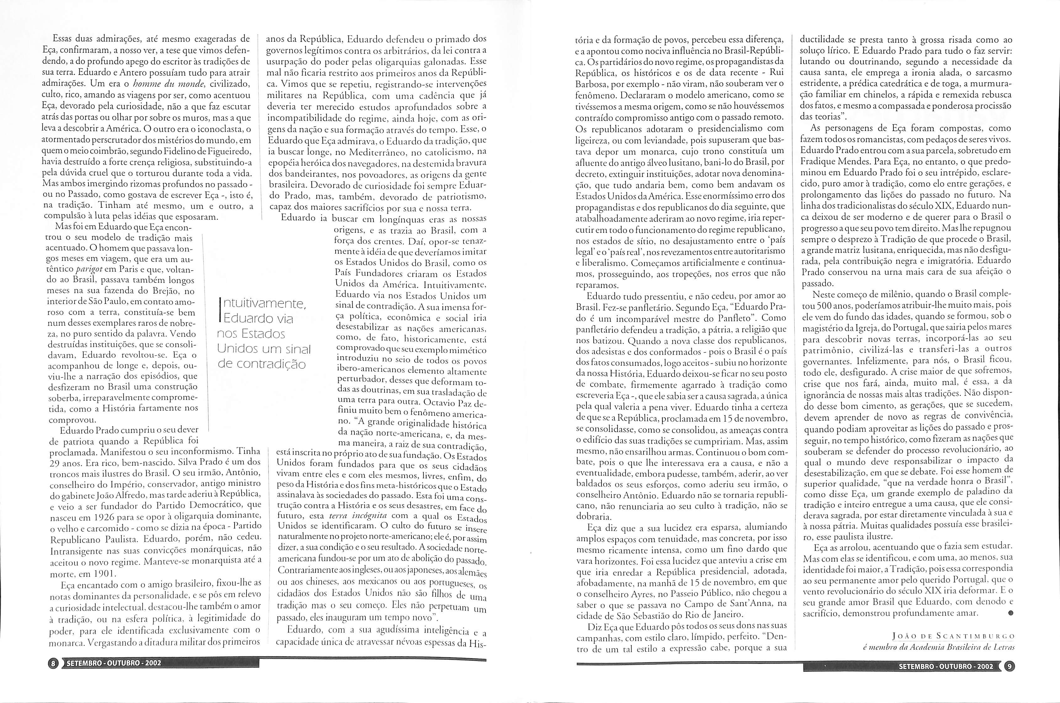 Eduardo tudo pressentiu, e não cedeu, por amor ao Brasil. Fez-se panfletário. Segundo Eça, “Eduardo Prado é um incomparável mestre do Panfleto”. Como panfictário defendeu a tradição, a pátria, a religião que nos batizou. Quando a nova classe dos republicanos, dos adesistas e dos conformados - pois o Brasil é o país dos fatos consumados, logo aceitos - subiu no horizonte da nossa História, Eduardo deixou-se ficar no seu posto de combate, firmemente agarrado à tradição como escrevería Eça -, que ele sabia ser a causa sagrada, a única pela qual valeria a pena viver. Eduardo tinha a certeza de que se consolidasse, como se consolidou, as ameaças contra o edifício das suas tradições mesmo, nãoensarllhou armas. Continuou o bom com bate, pois o que lhe interessava era a causa, e não a qual eventualidade, embora pudesse, tanabém, aderir, ao ver baldados mares para descobrir novas terras patrimônio governantes. Infelizmente. para nós todo ele, desfigurado. A crise maior de que sofremos, fará, ainda, muito mal, é essa, a da ense que nos ignorância de nossas mais altas tradições. Não dispon do desse bom cimento, as gerações, que se sucedem, devem aprender de novo as regras quando podiam aproveitar as lições do passado e pioshistórico, como fizeram as nações que de convivência, SC a República, proclamada em 15 de novembro.