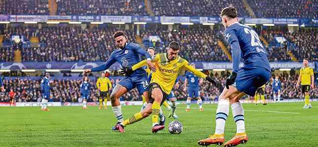 Reece James (i) trata de quitar el balón a Giovanni Reyna (c) durante el encuentro que el Chelsea le ganó a Borussia Dortmund AFP