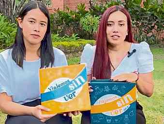 Las estudiantes María José Paredes Loaiza y Sara María Gómez Martínez con el libro Viajemos sin leer para lectura inclusiva ARCHIVO PART CULAR