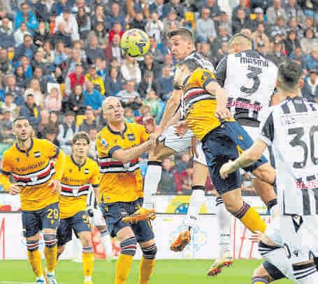 Adam Masina (3) marcó de cabeza el segundo gol del Udinese, el que sentenció el descenso de la Sampdoria en Italia EFE