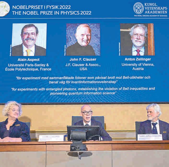 El trío de científicos fue galardonado por sus descubrimientos sobre el “entrelazamiento cuán tico”, un mecanismo en el que dos partículas cuánticas están perfecta mente correlacionadas, independiente de la dis tancia entre ellas, anun ció el jurado