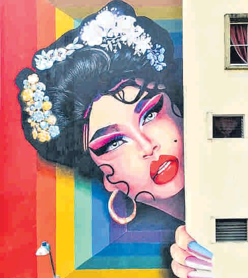 "El mural surgió el año pasado, cuando una ami ga, Antonia Otoya, me es cribió porque estaba con la idea de hacer un mural queriendo representar a la comunidad LGBTIQ+ y me dijo que quería tomar un personaje Me escogió y lo que hizo fue gratifican te: una figura que trata de salir del mural con los colo res de la diversidad Esto tiene mucho simbolismo”, cuenta Ramírez, quien re cuerda que entre semana vibra y trabaja como Darwin y los fines de se mana, despliega su arte con V13nrosa