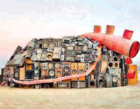 La instalación ‘Listen’, un corazón de parlantes reciclados, de los artistas Aaron Fowler y Erin Desmond, estará desde hoy en la Plaza de Bolívar, como abrebocas a la Feria de arte Barcú. Foto Barcú