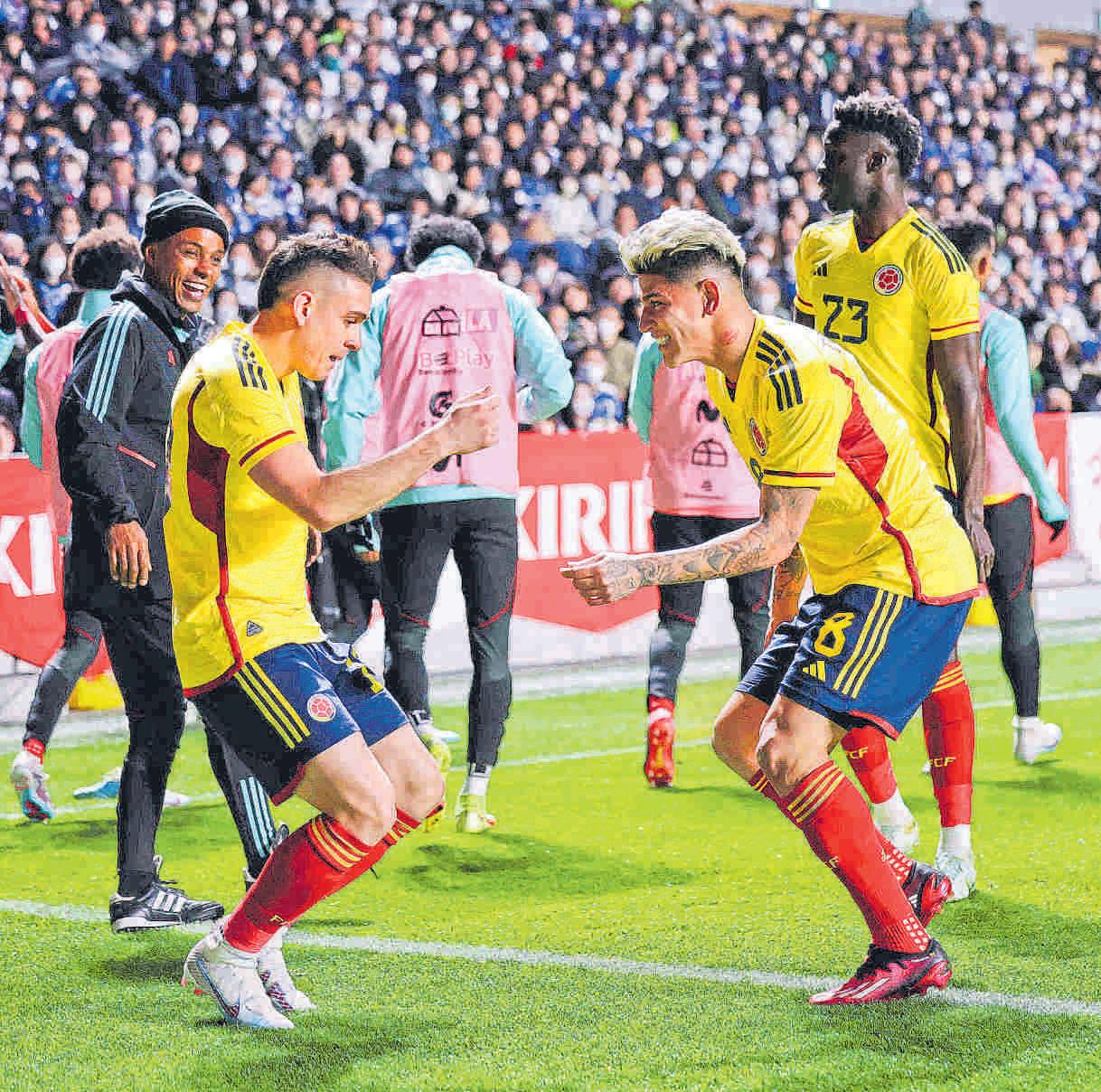 RAFAEL SANTOS Borré celebra con Carrascal su gol de chilena, con el que Colombia ganó 1-2, en amistoso, a Japón. PÁG 13