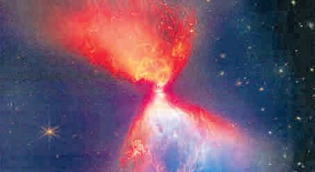 El telescopio espacial James Webb reveló nue vas imágenes de una in mensa nube de polvo en forma de reloj de arena en torno a una estrella en formación Las nu bes, de color azul y na ranja, fueron identifica
