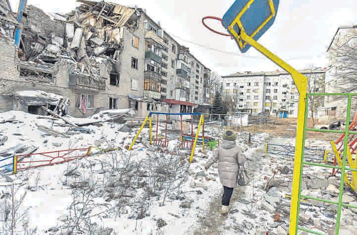 Un parque infantil en un conjunto residencial semidestrozado en Sviatohirsk, región de Donetsk EFE