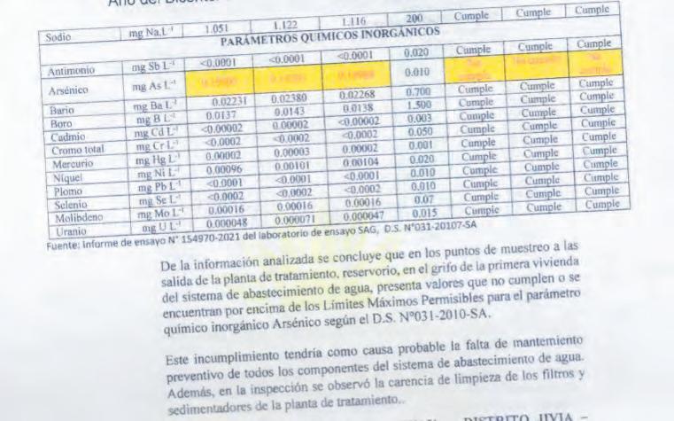 “El parámetro quími co inorgánico arsénico analizado no cumple o supera los límites máxi mos permisibles para las muestras de agua obte nidas en los puntos de monitoreo en la salida de la planta de tratamiento, reservorio y en el grifo de la vivienda”, mencionó las