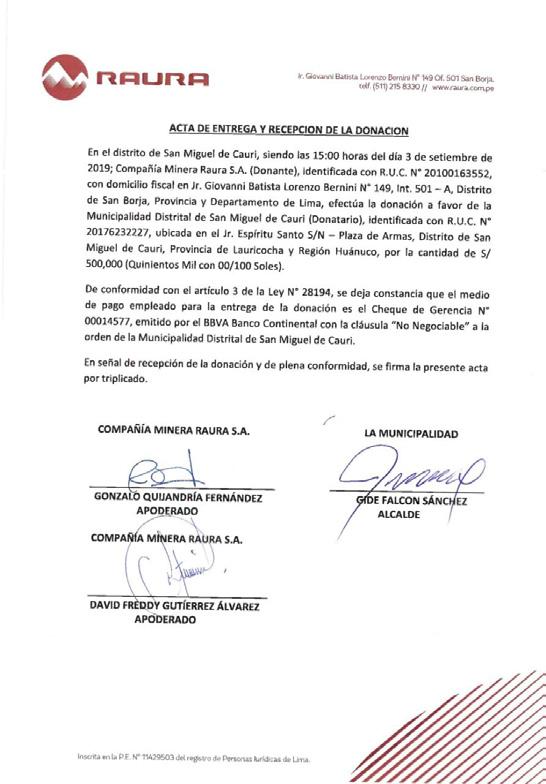 Tras el retiro del al calde, se conoció que dicha decisión se debió a que la presidencia de la Mesa, a cargo del Mi nem, le solicitó al bur gomaestre presentar los sustentos que acreditan la correcta ejecución de los fondos que la empresa Raura le había adelanta do a la municipalidad de Cauri.