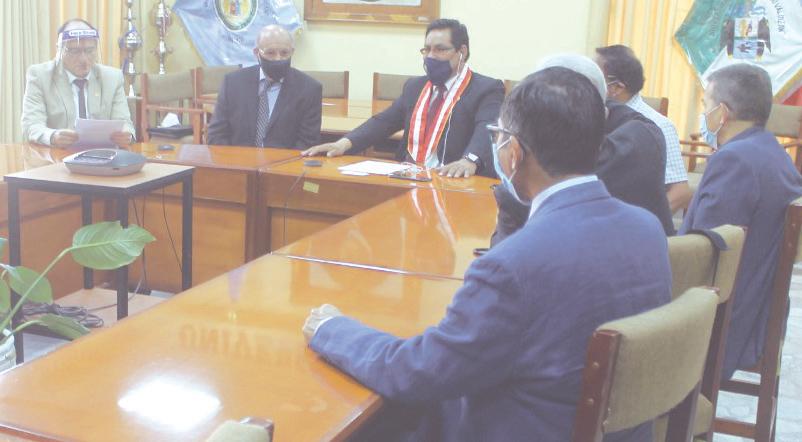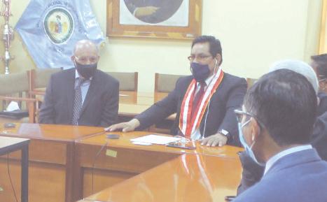 el rector de la Unheval, Reinaldo Ostros Miraval, el vicerrector académico Ewer Portocarrero Meri no, el rector de la escuela de postgrado Amancio Rojas Medina, el profesor José Goycochea Vargas en representación de la facultad de medicina ve terinaria y Marce Pérez Saavedra, exdecano de dicha facultad.