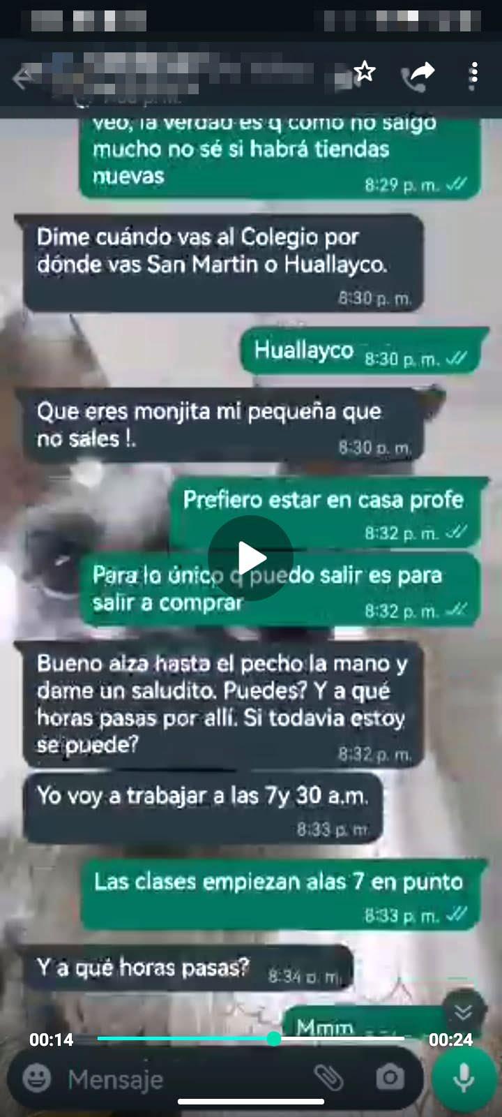 “Yo le escribo pretendiendo que soy mi hija y le digo que mañana le llevo la pensión de lo que le debo, entonces me sigue escribiendo, pero yo me había asesorado con un policía de la Divincri y me había dicho que le siga la corriente, en eso, ese señor me invita a su cuarto, me dice “ven a mi cuarto, para escuchar música, mi canelita, yo te amo, yo te quiero”, indicó el padre.