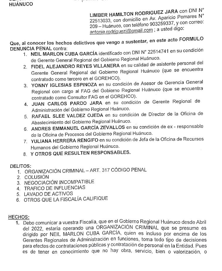 Ante la Junta de Fiscales Superiores del Distrito Fiscal Huánuco se presentó ayer una denuncia penal contra el gerente general, Neil Cuba García, a quien se le acusó de liderar una organización criminal enquistada en el Gobierno Regional de Huánuco (Gorehco).