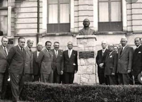 – Autoridades botucatuenses presentes à inauguração do busto do Dr. Cardoso de Almeida defronte a Escola Normal, tendo à frente os prefeitos Emílio Peduti e João Queiroz Reis, nas comemorações do Centenário de Botucatu.