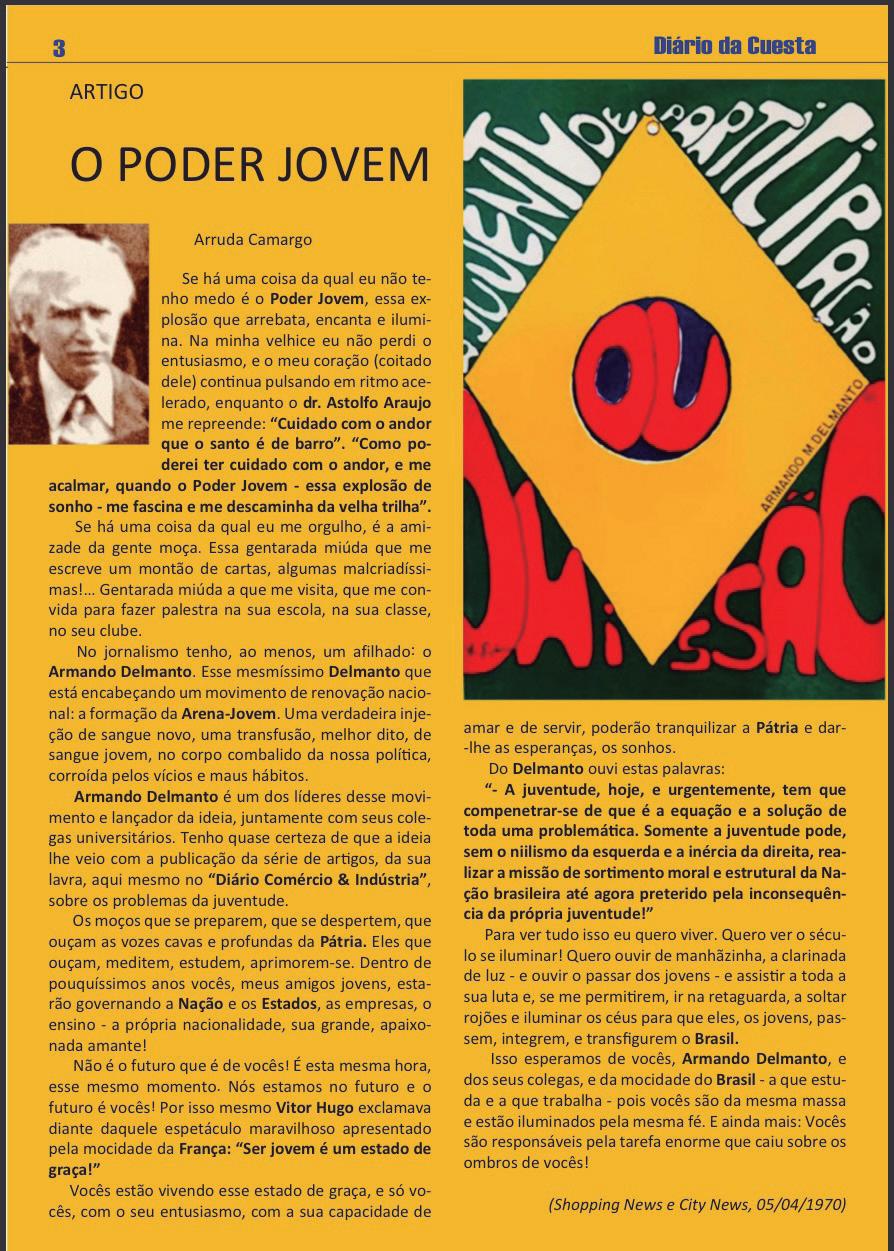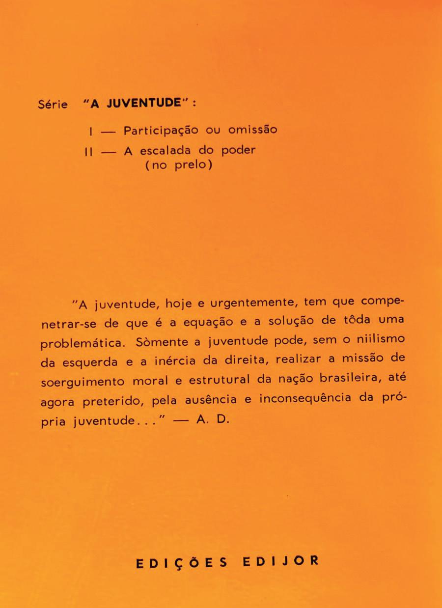O Brasil tem em sua juventude o seu maior e mais valioso capital, ou seja, tem este país o requisito principal para tornar-se aquilo para o qual sua própria grandeza territorial o predestina: o Estado líder da América Ltina. E para transformarmos o Brasil em uma Grande Potência é indispensável a participação da juventude. A juventude, hoje e urgentemente, tem que compenetrar-se de que é a equação e a solução de toda a problemática. Somente a juventude pode, sem o niilismo da esquerda e a inércia da direita, realizar a missão de sorguimento moral e estrutural da Nação Brasileira...