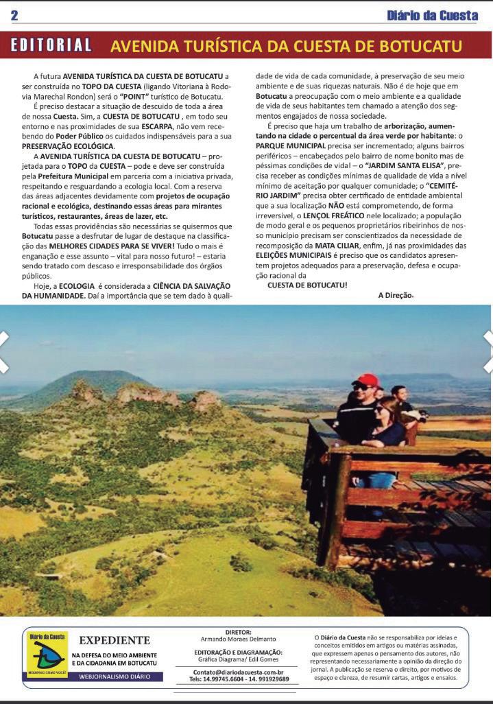 O Diário da Cuesta não se responsabiliza por ideias e conceitos emitidos em artigos ou matérias assinadas, que expressem apenas o pensamento dos autores, não representando necessariamente a opinião da direção do jornal. A publicação se reserva o direito, por motivos de espaço e clareza, de resumir cartas, artigos e ensaios.