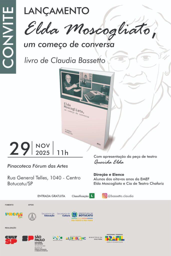 No dia 29 de novembro de 2025, às 11h, a Pinacoteca Fórum das Artes (Rua General Teles, 1040, Centro) recebe o lançamento do livro “Elda Moscogliato, um começo de conversa” (Editora Mireveja, 288 páginas), assinado por Claudia Bassetto, professora, artista visual e membro da Academia Botucatuense de Letras (ABL). Mais do que um livro, a publicação integra um projeto multimídia que celebra a leitura, a escrita, a cena teatral e a memória cultural de Botucatu (SP).