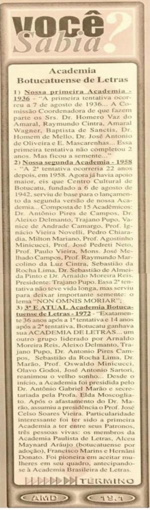 Cronista Maior – O destaque fica para os ensinamentos e a postura profissional da saudosa cronista Elda Moscogliato. Uma das idealizadoras e Alma Mater da ABL – Academia Botucatuense de Letras e a mais respeitada militante da imprensa botucatuense, Elda fez escola em nosso meio cultural e jornalístico. Desde seu início na Folha de Botucatu, passando pela Gazeta de Botucatu, pelo Vanguarda de Botucatu e em todas as edições da revista cultural de Botucatu, a Revista Peabiru