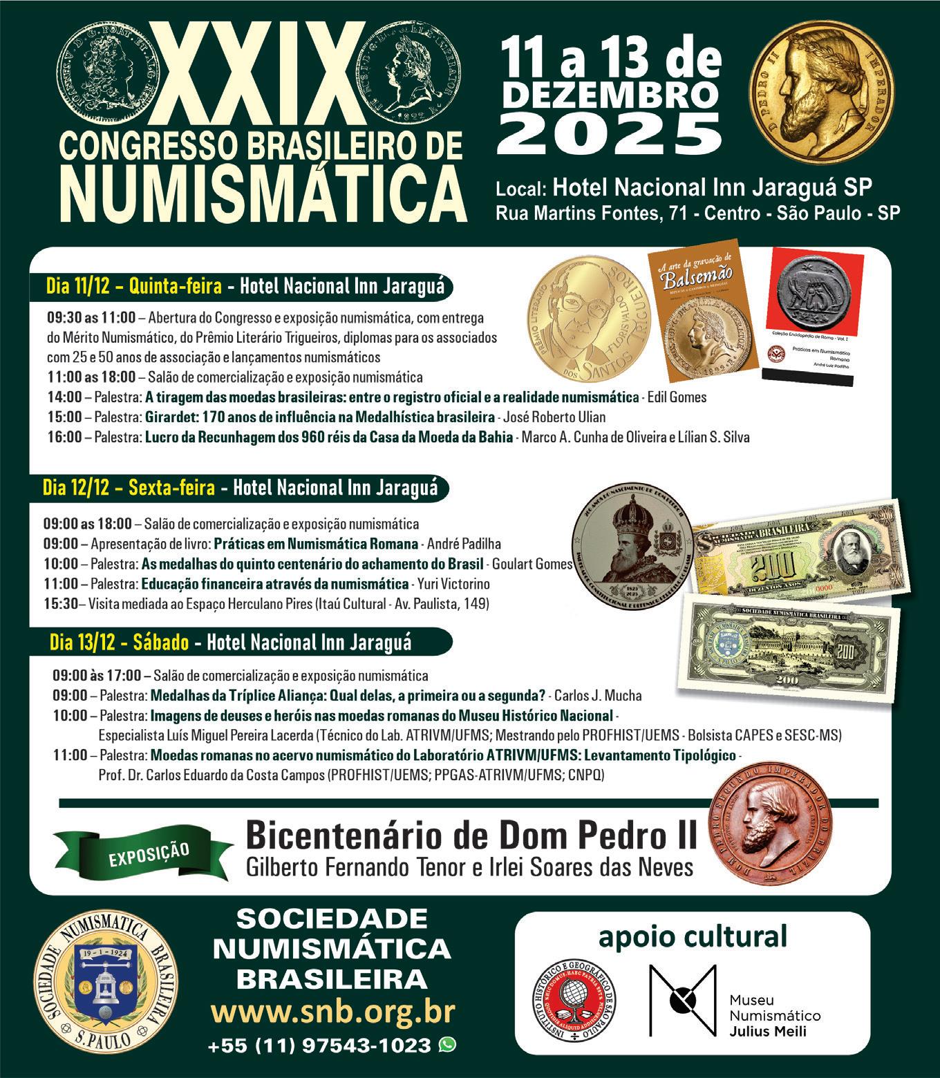 Durante o XXIV Congresso Brasileiro de Numismática da Sociedade Numismática Brasileira, realizado durante os dias 11 a 13 de dezembro de 2025, no Hotel Nacional Inn Jaraguá, situado na rua Martins Fontes, 71, será lançado o livro “A arte de gravação de Balsemão”, sendo os autores: Edil Gomes, Gilberto Fernando Tenor e Luiz Mendes. Página 2