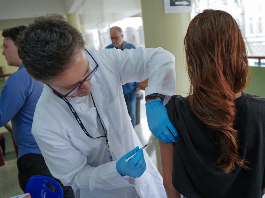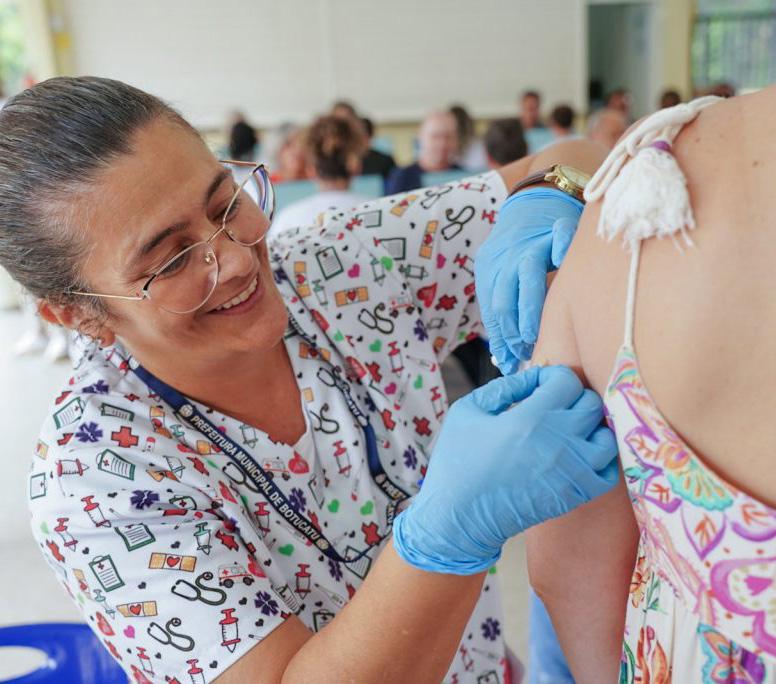 Profissional de saúde aplica vacina contra a dengue em Botucatu