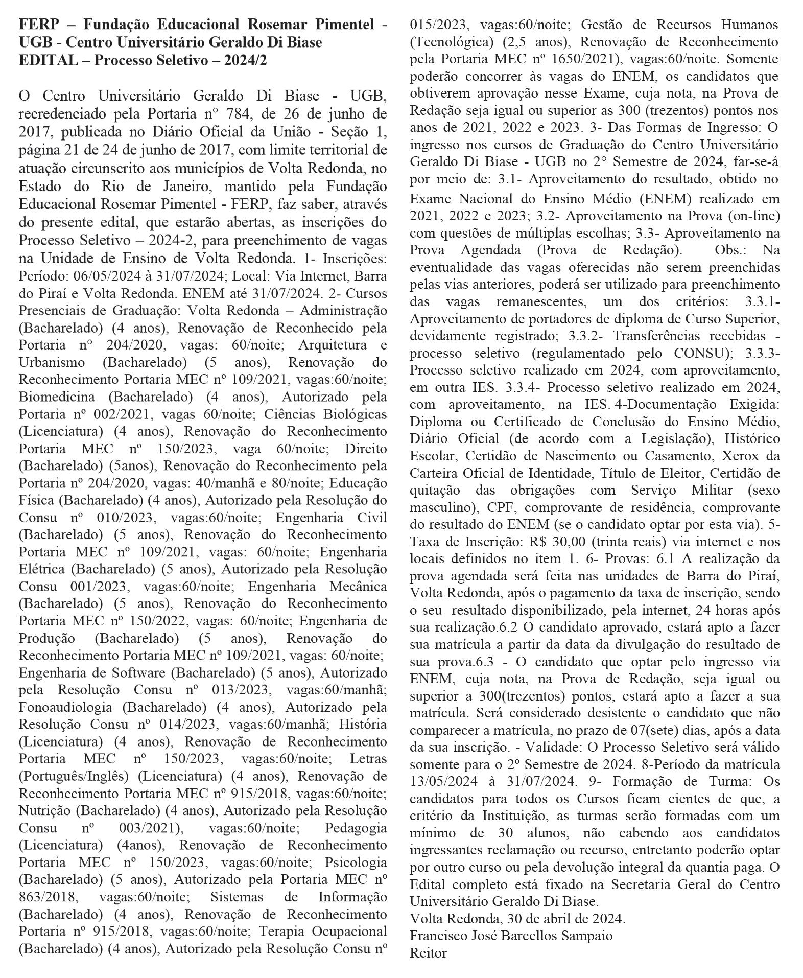 BRASIL S.A. torna público que entregou ao Instituto Estadual do Ambiente - INEA, em 08/04/2024, Relatório de Auditoria Ambiental do ano de 2023, para realizar a atividade de fabricação de tarugos de aço, fio máquina, barras, rolo, arames e perfis pequenos, com capacidade produtiva total de um milhão de toneladas por ano e informa que este estará à disposição para consulta na Avenida Francisco Fortes Filho, 242 - Jardim Aliança no Município de Resende, no período de 12/05/2024 a 12/06/2024 no horário das 7h às 17h. Informa, ainda, que o referido relatório também estará disponível para consulta no endereço eletrônico www.inea.rj.gov.br/biblioteca. (Processo E-07/506613/2009)