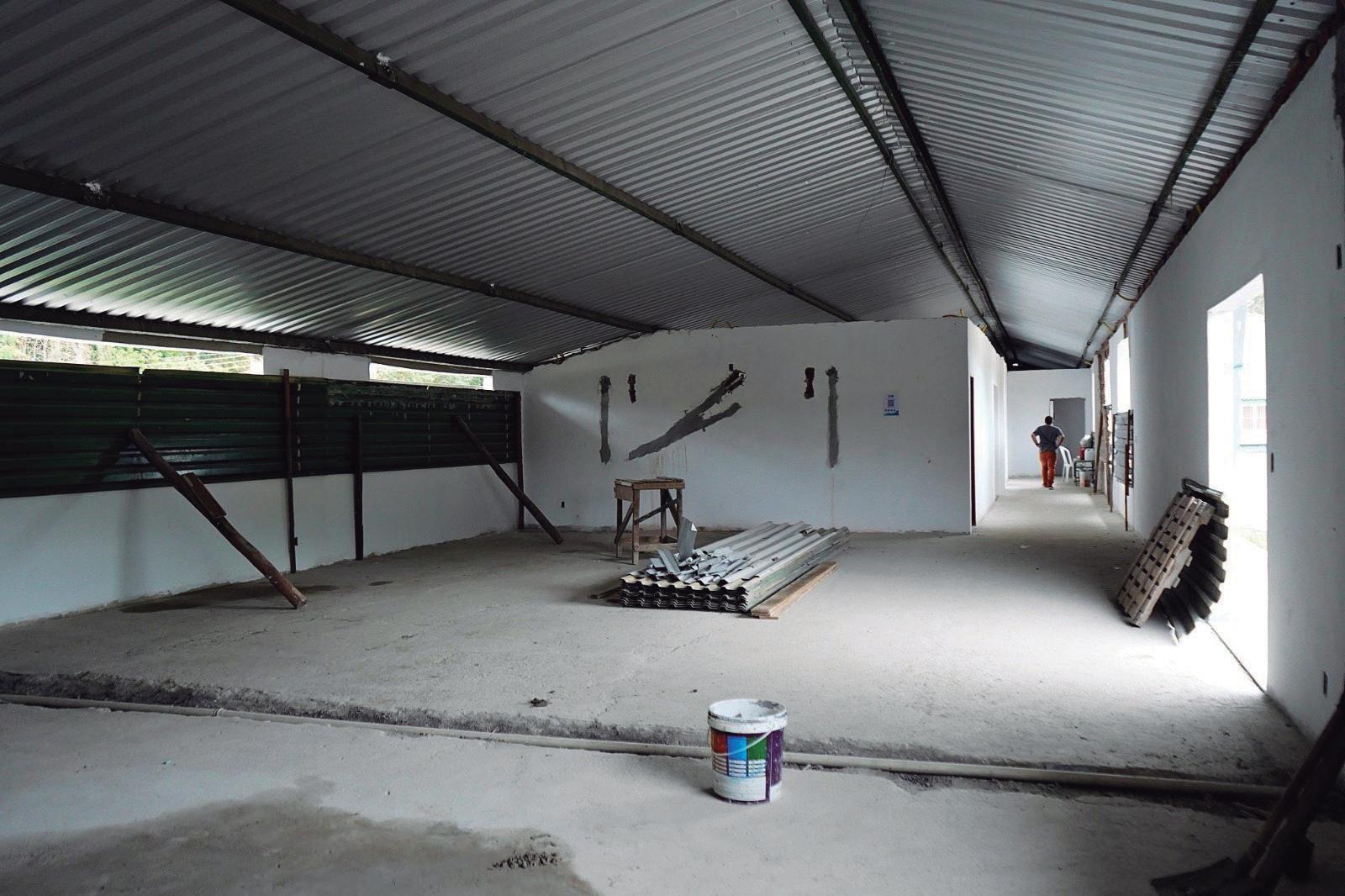 Construído na Ilha São João, o futuro hospital já passou pela fase das fundações e contrapiso e finaliza a parte de alvenaria. Todas as paredes já foram erguidas e a parte externa já recebeu o emboço com textura; na parte interna, as últimas paredes recebiam o emboço. Todo o telhado já foi colocado, restando a instalação do forro.