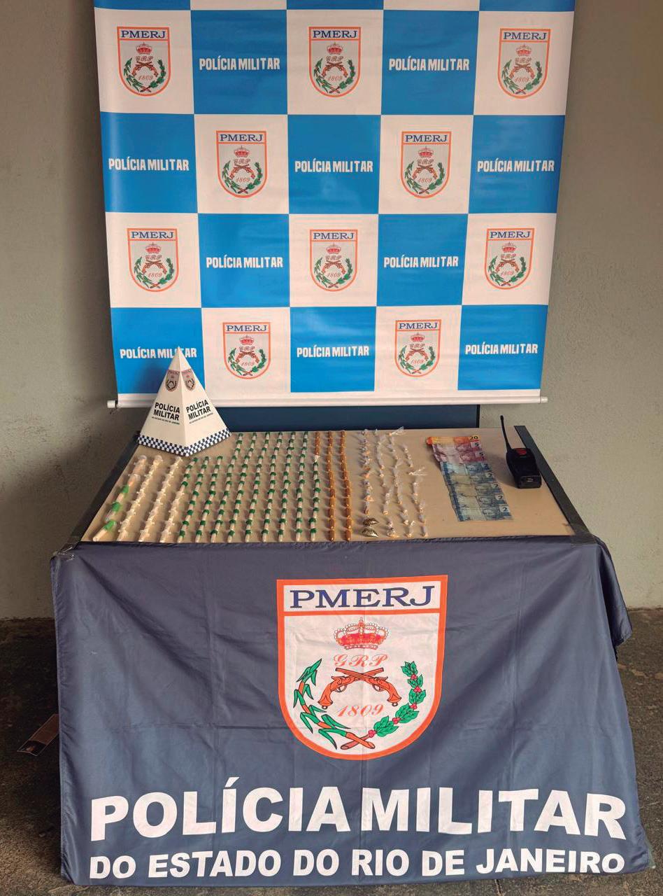 do escadão. Com eles, foram encontrados 158 pinos de cocaína, 43 pedras de crack, dois sacolés de maconha, R$ 40 em dinheiro e um rádio comunicador.