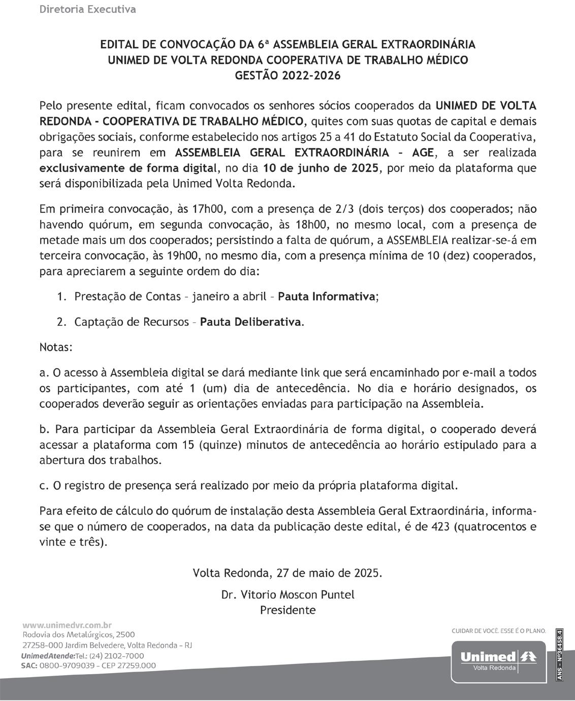 A sessão de disputa do pregão iniciará no dia 16 de junho de 2025, às 10:00hs, no Portal da Bolsa de licitações do Brasil-BLL no endereço www.bll.org.br. O Edital está disponível para download em transparencia.quatis.rj.gov.br Quatis, 26 de maio de 2025.