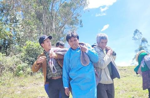 FOTOGRAFÍAS DE MUJER LLEVADA EN HOMBROS POR EL PERSONAL DE SALUD Y COMUNEROS EMOCIONARON A USUARIOS DE REDES SOCIALES. A PESAR DEL DIFÍCIL ACCESO, LA TRASLADARON HASTA HOSPITAL.