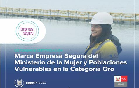El Ministerio de la Mujer y Poblaciones Vulnerables (MIMP) otorgó el sello, en la categoría oro, marca “Empresa Segura” a Gold Fields por su gran aporte como em presa en la promoción de espacios libres de violencia y discriminación contra la mujer, cumpliendo en la acreditación de estándares de calidad, el incremento de acciones de promoción de la igualdad de género y propiciando una mejor calidad de vida para todas y todos en la comunidad donde opera en Hualga yoc- Cajamarca.