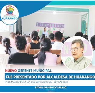 La alcaldesa distrital de Huarango, Esther Sarmiento Tarrillo, presentó a José Antonio Vásquez Ampa como nuevo gerente municipal de la Municipalidad Distrital de Huarango. Dicha decisión se realiza en cumplimiento de la Ley del Servicio Civil - Ley Nº 30057.