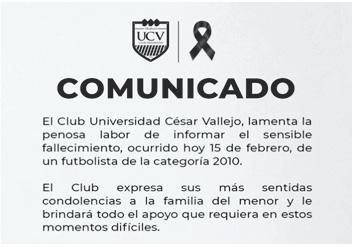 “El Club Universidad César Vallejo, lamenta la penosa labor de informar el sensible fallecimiento, ocurrido hoy 15 de febrero, de un futbolista de la categoría 2010. El Club expresa sus más sentidas condolencias a la familia del menor y le brindará todo el apoyo que requiera en estos momentos difíciles”, se lee en el comunicado que emitió el