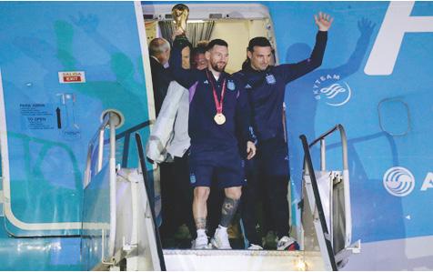Al ritmo del popular “Muchachos”, el himno oficioso de Argentina en este torneo, cantado en la misma pista por el grupo “La Mosca Tse tse”, Messi salió del avión levantando el trofeo junto al técnico Lionel Scaloni.