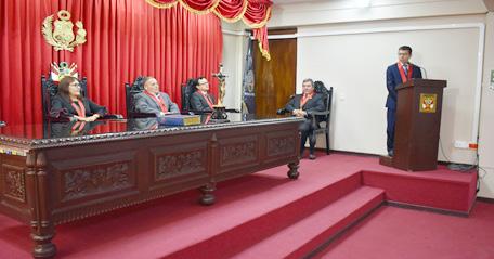 En la ceremonia protocolar desa rrollada en el auditórium de la Sede Central, Edith Alvarado, por encargo especial del señor presidente de Cor te, destacó las cualidades del doctor Francisco Quiroz, recomendándole continuar con su compromiso para