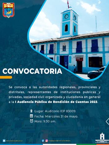 Cajamarca.- La Contraloría General invita a la ciudadanía y sociedad civil de los 7 distritos de la provincia de San Ignacio a presentar alertas y/o denuncias sobre presuntas irregularidades en obras públicas, contrataciones, ejecución presupuestal, entre otros, así como deficiencias en servicios públicos, durante la audiencia pública presencial virtual “La Contraloría te escucha” que se realizará este martes 30 de mayo. La actividad tiene como finalidad promover la participación ciudadana para que con sus alertas y/o denuncias, participen y contribuyan al control gubernamental para la mejora de los servicios pú-