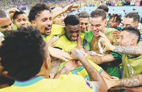 partido durante bastantes minutos, cerrando espacios a Brasil y haciendo buena esa máxima: “si tú tienes el balón, tu rival no lo tiene”. Johann Cruyff era un genio. La presión alta de los suizos, unido a un centro del cam po poco creativo, que echa de menos la creatividad del ‘10’, obligó a volcar el juego brasileño a la banda. Mien tras Neymar tenía que ver el partido desde el hotel, con el dolorido tobillo en alto, Raphinha asumía el papel protagonista.