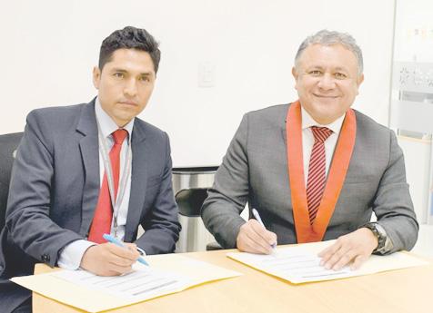 criba Najarro, Coordinador del Centro MAC Cajamarca y Sub Secretario de Calidad, luego de firmar el convenio que da inicio al servicio que brindará la Corte en el Centro MAC del Real Plaza Cajamarca. El presidente de la Corte de Cajamarca, Percy Horna León, acompañado de la jueza superior Edith Irma Alvarado Palacios, jefa de la ODECMA Cajamarca, participó de la puesta en marcha del módulo de atención al público que prestará servicios con rapidez, confianza, transparencia y comodidad. El módulo de la Corte de Cajamarca, como una buena práctica acorde con la modernización de la gestión pública, ha iniciado sus operaciones y atenderá sólo de lunes a viernes desde las